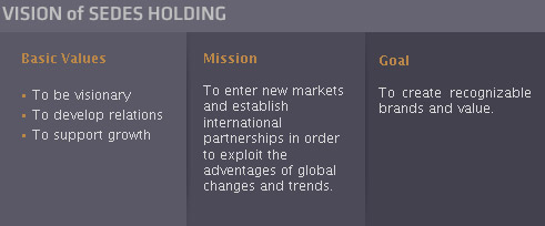 SEDES A.S. was founded by Demir SABANCI on 09.04.2002. The Company name was registered as Sedes Holding A.S. on 12.12.2006 with the changes in related clauses on articles of association. Sedes Holding carries out its activities in the following sectors: Electronics Retailing, Aviation, Logistics, Plastic Packaging, Insurance, Real Estate Development and Personal Care and Cosmetics Retailing. ODESA POLYMER, DÖYSA VIP HAVACILIK, ELECTROWORLD, DEMAS INTERNATIONAL, SEDES SIGORTA AND GRATIS are the companies which take place within its organisation. SEDES HOLDING invests in sectors with sustainable growth potential where advances in development can be realized.